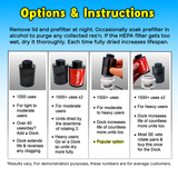 Remove prefilter at night to ventilate. Soak it in alcohol as needed to purge resin. Fully dry HEPA filter occasionally with Dock.