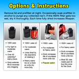 Remove prefilter at night to ventilate. Soak it in alcohol as needed to purge resin. Fully dry HEPA filter occasionally with Dock.